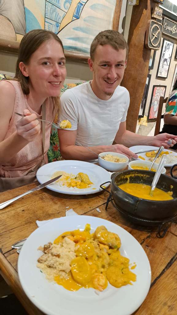 Angekommen in Itacaré gingen wir abends direkt in die kleine Einkaufsstraße der Stadt. Obwohl man hier merkt, dass dorthin mittlerweile viele Touristen kommen, wirkt die Straße sehr gemütlich und nicht überlaufen. Man kann hier wirklich superlecker Essen gehen. Eines unserer Lieblingsgerichte dort war Moqueca. Dies ist ein Nationalgericht Brasiliens und ein typisches Beispiel für die Vermischung von afrikanischer mir lokaler Küche. Die bekannteste Variante ist die Moqueca Baiana: Ein Fischeintopf aus Fischfilets, Kokosmilch, Palmöl und Tomaten.