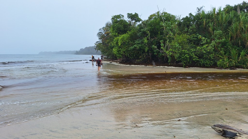 Die absolut härteste Challange kam dann aber zum Ende hin. Wir sind bereits 7km durch den Park gelaufen, als ein Schild kam, auf dem stand „Achtung, Flussregion, Sie betreten das Gebiet von Krokodilen“. Wir nahmen das relativ entspannt hin und dachten, dass es dann ja wohl eine Brücke über diesen Fluss gibt. Alles easy….als wir dann aber zu der Flussüberquerung kamen, stockte uns der Atem. Der Fluss mündete an dieser Stelle direkt ins Meer, es gab keine Brücke und das Wasser war in der flachsten Stelle in etwa Oberschenkeltief. Tja, was nun? Wir sahen immer mal wieder ein paar vereinzelte Menschen das Wasser überqueren, aber so richtig wohl war uns bei der Sache nicht. Wir standen nun also vor der Option, umzudrehen und die 7km zurückzulaufen oder da durch zu gehen. Wir schauten uns das Geschehen noch etwas an, entschieden uns dann aber es durchzuziehen und schnell durch das Wasser zu waten. Der Puls war hoch, aber wir schafften es wohlbehalten auf die andere Seite und waren sehr stolz auf uns!