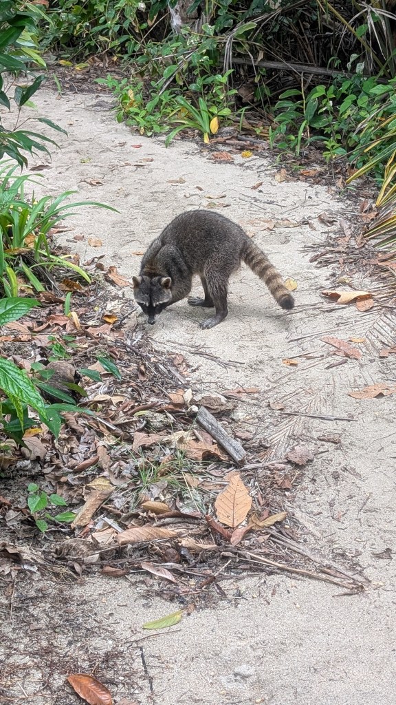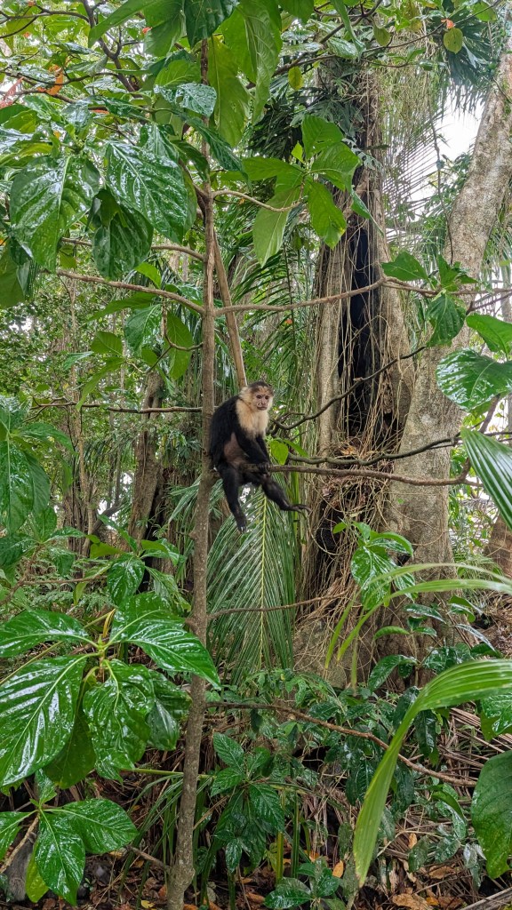 Am zweiten Tag machten wir uns auf den Weg in den Cahuita Nationalpark. Der Nationalpark zählt zu einem der ältesten und zugleich interessantesten Nationalparks von Costa Rica. Der Vorteil des Nationalparks ist vor allem der, dass der Park auf relativ kleiner Fläche viel zu bieten hat. Man hat sowohl traumhafte Strände als auch einen Regenwald voller interessanter Pflanzen und Tiere. Da wir bereits um 9 Uhr mit unserer Wanderung starteten, waren noch kaum Menschen dort. So hatten wir den Park zu Beginn fast für uns allein und konnten den Fröschen beim Quaken zuhören. Außerdem haben wir immer mal wieder Affen brüllen hören, wussten aber nicht ganz, wo sich diese befanden. Nachdem der erste Pfad durch den Dschungel führt, kommt man irgendwann am Strand heraus und setzt die Wanderung dann mit direktem Meeresblick fort. Die Wege waren dabei sehr abenteuerlich und waren teilweise sandig und matschig, aber da wir als Deutsche mit unseren Wanderschuhen gut vorbereitet waren (stimmt’s Michi?) war das natürlich kein Problem für uns. Auf dem Weg trafen wir immer mal wieder das ein oder andere Tier an. So flog uns immer wieder ein wunderschöner blauer Schmetterling über den Weg. Außerdem kreuzte ein Waschbär unseren Weg (wenn wir nicht ausgewichen wären, er hätte es auch nicht getan) und wir trafen viele kleine Kapuzineräffchen an.