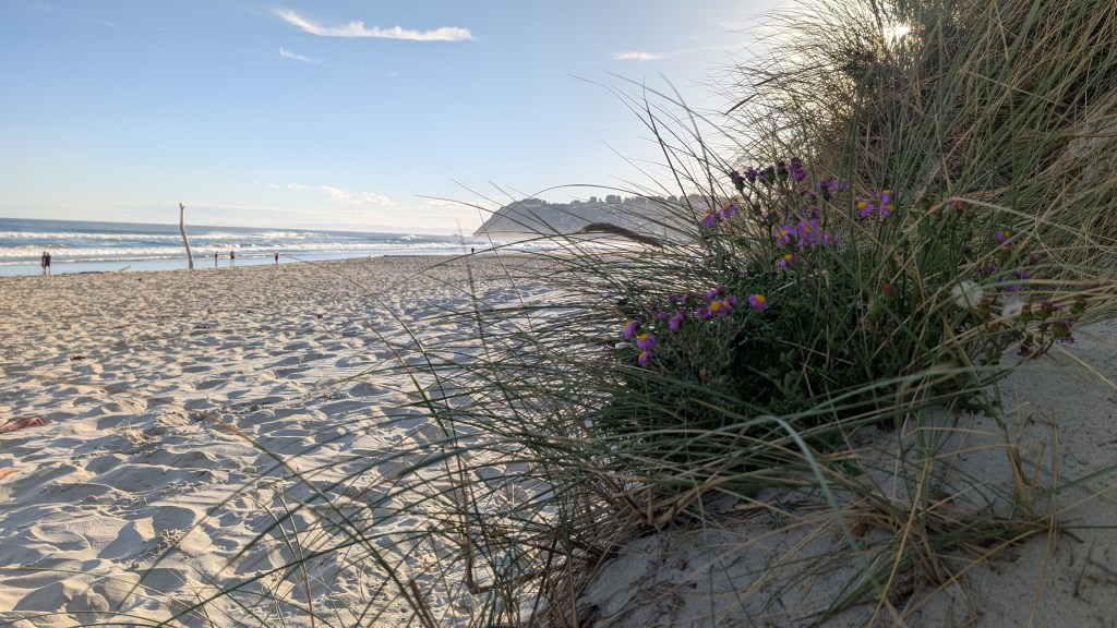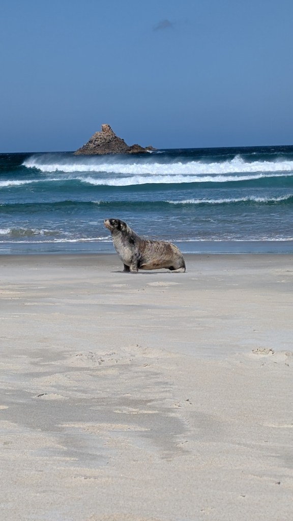 Die andere Wanderung führte uns durch goldgelbes Gras und einer Dünenandschaft an einen tollen, menschenleeren Naturstrand. Hier hatten wir das Glück Seelöwen zu sehen, die in der Sonne dösten.