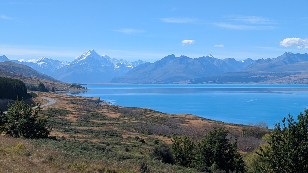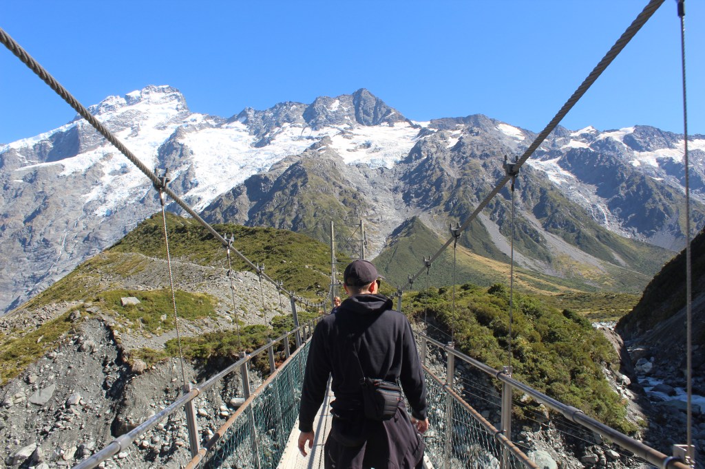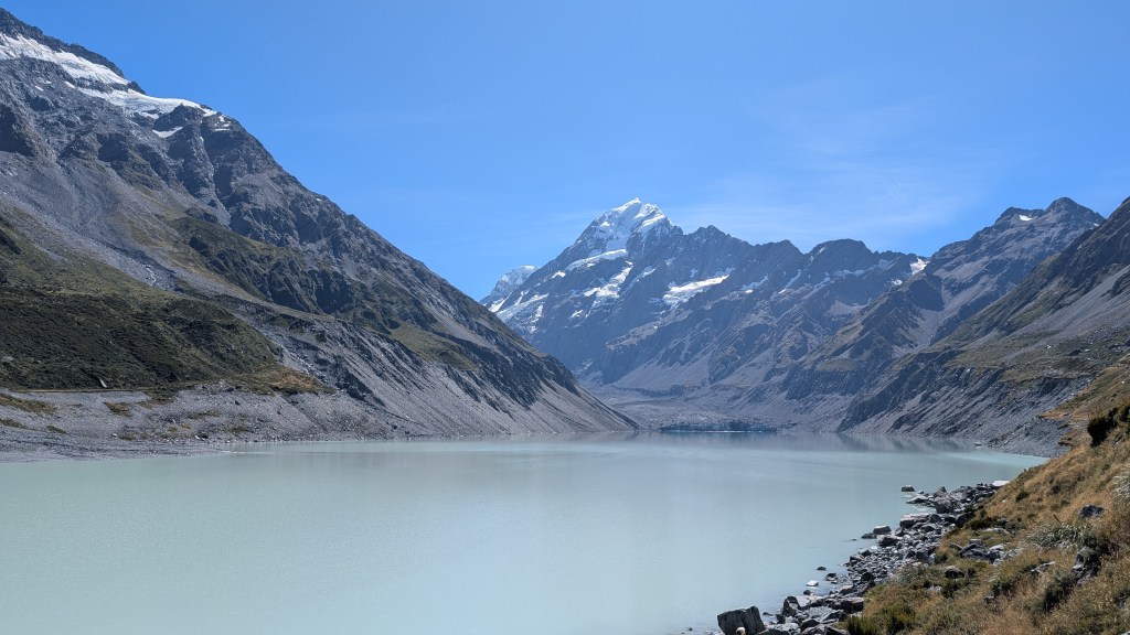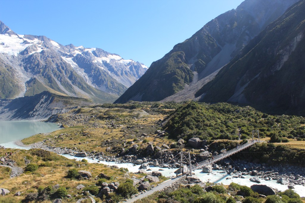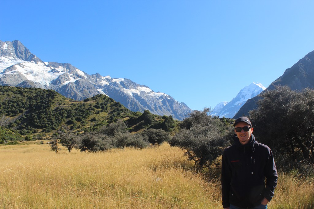 Am nächsten Tag machten wir uns auf den Weg in Richtung Mount Cook. Der Mount Cook ist mit über 3.000 Metern der höchste Berg Neuseelands und ist Teil des Mount Cook National Parks. Wir entschieden uns dazu, den 10km langen Hooker Valley Track zu laufen, der zwischen einem wunderschönen Bergpanorama entlang führt. Hier ist der Weg das Ziel und zwischendurch hat man auch immer wieder Zeit innezuhalten und die schöne Aussicht zu genießen. Auch wenn dieser Weg zu einer der beliebtesten Routen im Nationalpark gehört und man sich den Weg mit vielen anderen Leuten teilen muss, lohnt sich dieser Track auf alle Fälle.