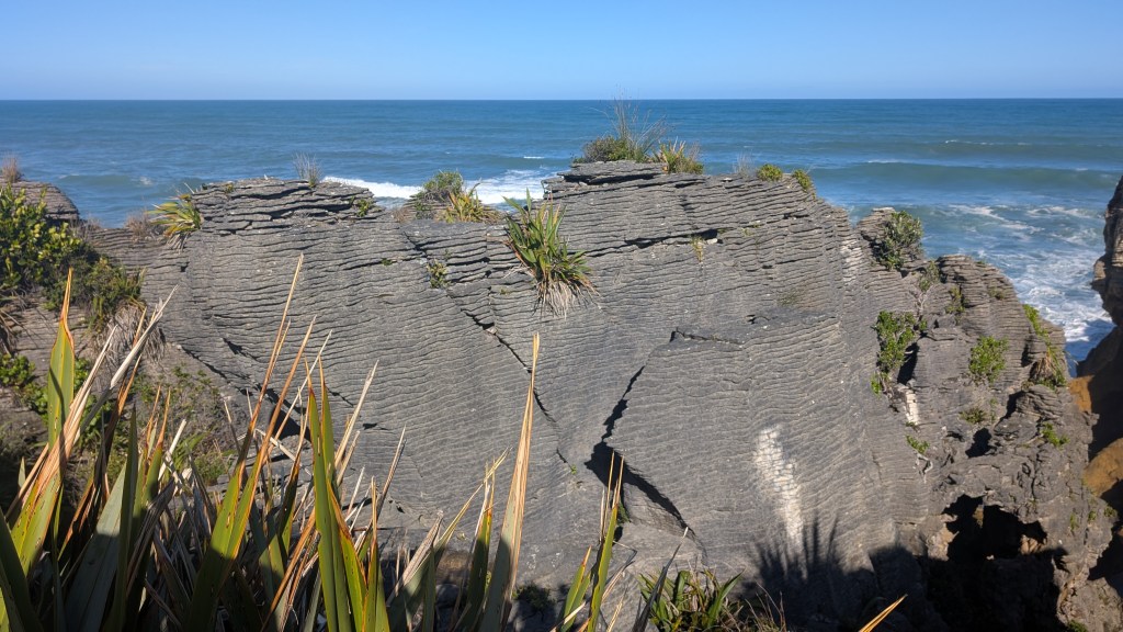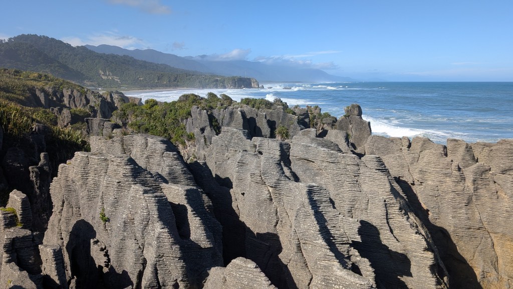 Ein letzter Stopp sollten für uns die Pancake Rocks in der Nähe des Örtchens Punakaiki weiter nördlich sein. Das Besondere an den Felsen ist dabei, dass sie wie übereinander geschichtete Pfannkuchen aussehen. Deshalb auch der Name „Pancake Rocks“.