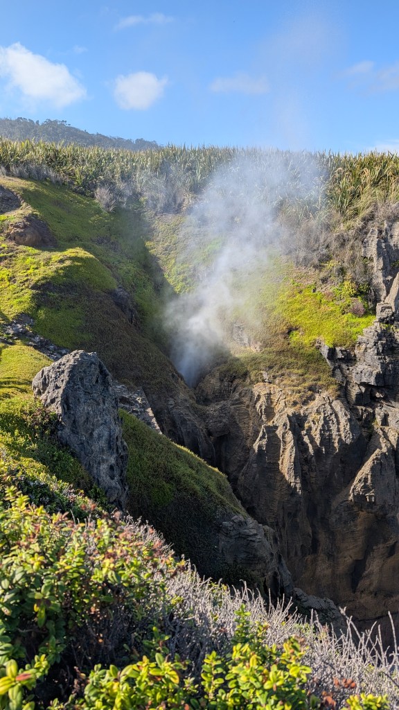 Fast genauso sehenswert fanden wir die „Blow Holes“, an denen man auf dem Weg zu den Pancake Rocks sowieso vorbeiläuft. Hierbei schießt eine Wasserfontäne in die Luft, sobald eine Brandungswelle auf die Mündung der Höhle trifft.