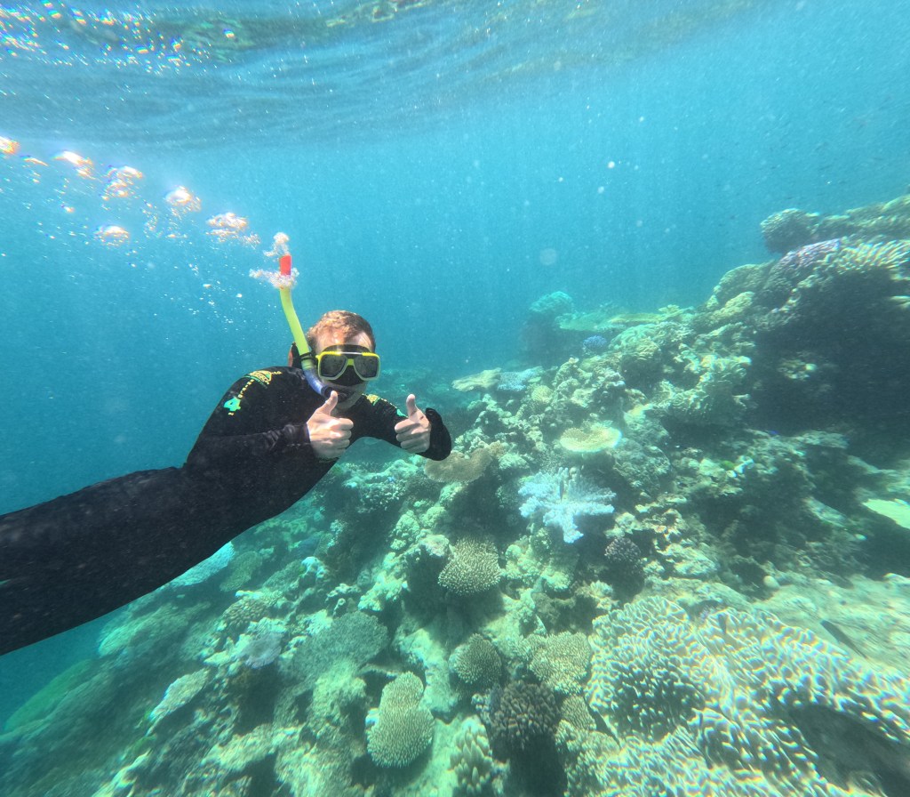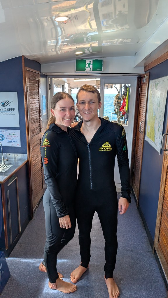 Der eigentliche Grund, warum wir jedoch nach Cairns reisen wollten, war das einzigartige Great Barrier Reef. Dieses erstreckt sich über 2.000km entlang der Nordostküste Australiens und man kann es aufgrund seiner Größe sogar aus dem Weltraum sehen. Von Cairns aus, kann man Schnorcheltouren buchen, die einen direkt ans Riff bringen. Wir empfehlen auf jeden Fall eine Tour ans Outer Reef zu buchen. Wir waren dort fast alleine und konnten in Ruhe das Riff erkunden. Allerdings muss man bedenken, dass sich das Riff nicht direkt an der Küste befindet und man erst einmal ca 2h hinaus aufs Meer fährt (ist daher auch nichts für Leute, die leicht seekrank werden). Steffen war auch nicht so ganz wohl bei der Hinfahrt 😂. Mal abgesehen davon war unsere Tour super organisiert und wir haben auf der Hinfahrt noch einen Vortrag von einem Meeresbiologen bekommen und uns wurde erklärt, auf was wir achten sollten, wenn wir ins Wasser gehen. Ganz wichtig: auf keinen Fall etwas anfassen, da viele Korallen bzw. Fische giftig sein können und auch sehr empfindlich reagieren. Da wir uns außerdem in der Quallensaison befanden (und die Quallen in Australien sind super giftig!) waren wir verpflichtet einen Stinger Suit anzuziehen. Dieser Ganzkörperanzug sollte uns vor Quallen schützen. Dann ging es auch schon ab ins Wasser. Und was sollen wir sagen: wir haben wirklich nicht damit gerechnet, ein so lebendiges Riff vorzufinden. Wir wissen natürlich nicht, wie es an anderen Stellen des Riffs aussieht, aber an den Schnorchelspots, die wir besuchten, waren so viele bunte Korallen und Fische, sodass wir gar nicht wussten, wohin wir als erstes schauen sollten. Es ist nicht gelogen, wenn wir uns teilweise wie bei „Findet Nemo“ gefühlt haben. Es war wie in einer anderen Welt, die wunderschön aber zugleich auch super zerbrechlich aussah. Wir hatten sogar das Glück einen kleinen Riffhai zu erblicken. Im Nachgang sind wir soooo unglaublich dankbar, dass wir dieses Erlebnis machen durften und werden in vielen Jahren auch immer wieder gerne daran zurückdenken.