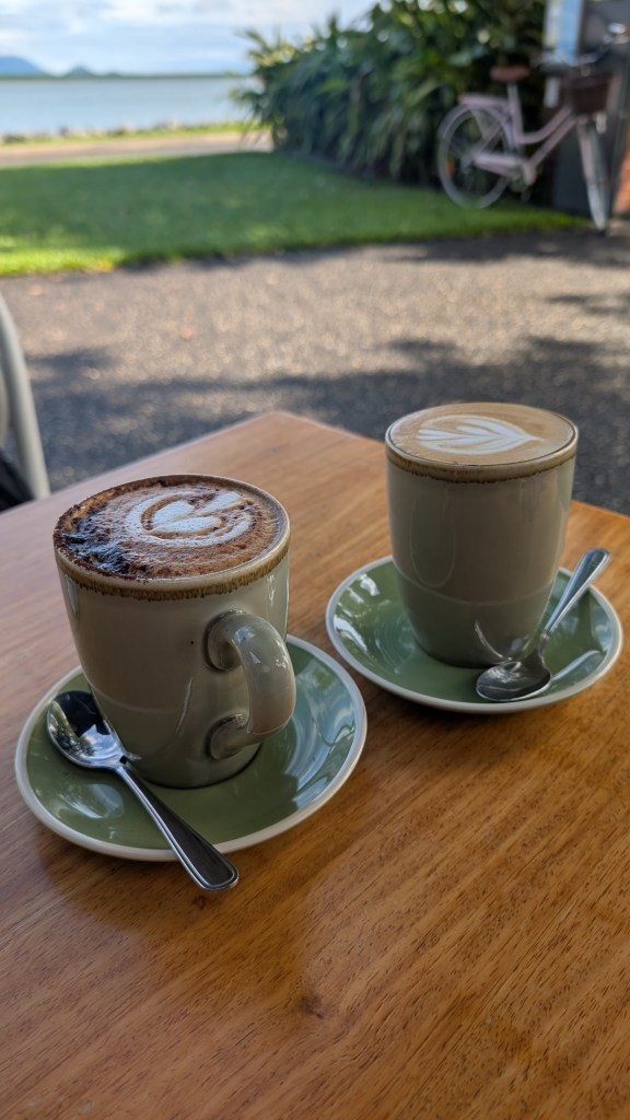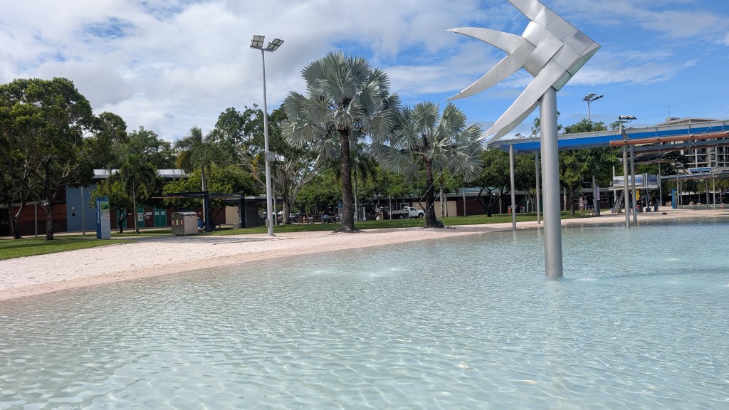 Angekommen in Cairns kam uns erst einmal eine tropische Hitze entgegen. Cairns befindet sich im März immer noch in der Regenzeit. D.h. es hat jeden Tag über 30 Grad, aber es regnet eigentlich auch jeden Tag einmal oder mehrmals. Als wir ankamen hatten wir Glück, denn es schien tatsächlich die Sonne. So entschieden wir uns erst einmal für einen kleinen Spaziergang an der Promenade. Vom Baden im Meer wird hier abgeraten, da sich hier auch gerne mal das ein oder andere Krokodil im Wasser tummelt. Dafur hat die Stadt aber eine coole künstlich angelegte Lagune, die man kostenlos nutzen kann.