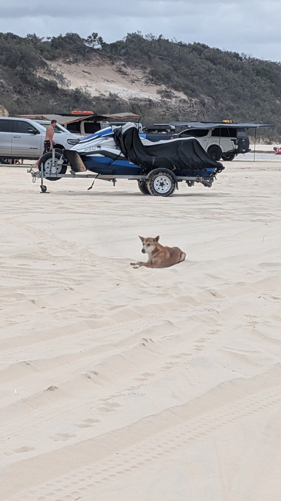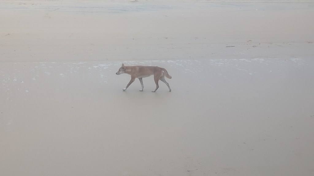 Wir sind dann auch dort entlang gefahren und haben bereits auf dem Weg schon einige Dingos sichten können. Es handelt sich dabei um einen Haushund, der vor Jahrtausenden verwilderte und nun auf K’gari lebt. Obwohl die Tiere aussehen wie normale Hunde, darf man nicht vergessen, dass es sich um wilde Tiere handelt und diese auch für den Menschen gefährlich werden können. Unser Guide meinte, wir sollten immer aufmerksam durch die Gegend laufen. Falls wir einem Dingo über den Weg laufen sollten, sollen wir uns direkt zu dem Dingo wenden und uns groß machen. Auf keinen Fall wegrennen. So erkundeten wir die Insel und ja, Schlangen gibt es ja laut den Schildern eh überall, aber auch hier haben wir wieder keine zu Gesicht bekommen 😂. Tatsächlich trafen wir einige Dingos an, aber das Zusammentreffen war zu keiner Zeit bedrohlich.