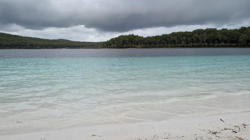 Ein weiters Highlight war der Lake Mckenzie. Dieser glasklare Süßwassersee befindet sich im Herzen der Insel und ist durch Regenwasser auf dem Sand entstanden. Charakteristisch für den See ist die türkisfarbene Umrandung und der tiefblaue Innenbereich. Diese kommt zustande, da der See außen sehr flach ist und es über eine Kante direkt ins tiefe Wasser geht. An der tiefsten Stelle ist der See 5m tief. Da das Wetter mittlerweile nicht mehr ganz so gut war und es schon leicht anfing zu regnen, sprangen wir kurz in den See und machten uns im Anschluss auf den Heimweg.