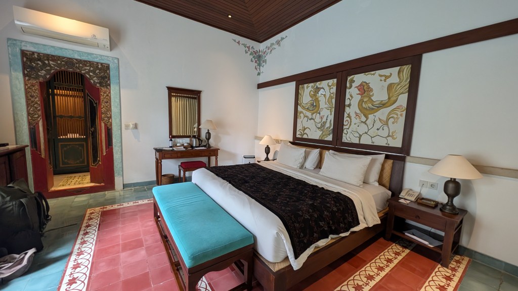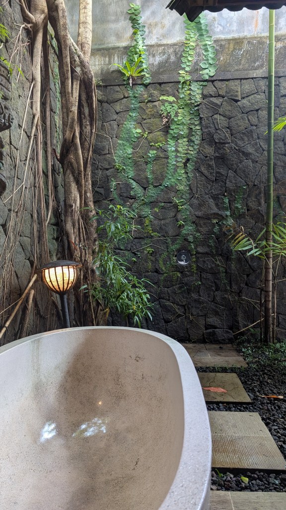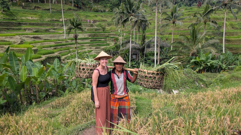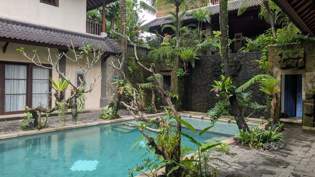 Die nächsten drei Nächte wollten wir im Anschluss in Ubud verbringen. Ubud befindet sich weiter im Landesinneren und gilt als kulturelles Zentrum Balis. Was uns als erstes aufgefallen ist, war der wirklich schreckliche Verkehr. Die Innenstadt war so dermaßen vollgestopft und überall fahren Roller kreuz und quer über die Straße. Wir hatten mit vielen Menschen und Rollerverkehr gerechnet, aber da wir uns eigentlich immer noch in der Nebensaison befanden, hatten wir nicht gedacht, dass es dann doch so überfüllt sein wird. Daher waren wir froh, dass sich unsere Unterkunft etwas außerhalb befand. Im Allgemeinen war unsere Unterkunft ein Traum! Jeder von uns hatte ein wunderschönes, im balinesischen Stil eingerichtetes, Zimmer mit einem Bad und einer Außendusche. Die Angestellten waren so herzlich, dass wir uns bei jeder Rückkehr ins Hotel so fühlten, als ob wir „nach Hause“ kommen würden. Zudem hatte man jeden Morgen die Möglichkeit an einer Yoga-Einheit teilzunehmen und eine Massage bekam man auch umsonst dazu.