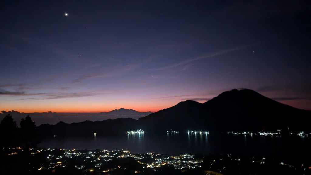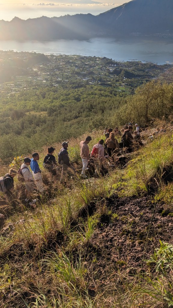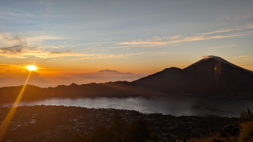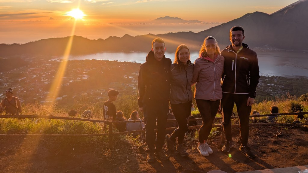 An dem Abend ging es für uns dann jedoch schon sehr früh ins Bett, da wir am nächsten Morgen um 2 Uhr aufstehen mussten. Geplant war eine Sonnenaufgangstour zum, mittlerweile inaktiven Vulkan, Mount Batur. Wir hatten die Tour zwei Tage vorher in Ubud an einem Tourismusstand gebucht und wurden früh morgens von einem Bus abgeholt und zum Startpunkt gebracht. Der Bus war sah im allgemeinen schon etwas mitgenommen aus und stank die gesamte Fahrt über stark nach Benzin. Wir waren demnach wirklich froh, als wir am Startpunkt ankamen. Was uns dort dann erwartete war allerdings ganz anders, als wir uns das vorgestellt hatten. Mit uns sind unglaublich viele Menschen auf den Berg hochgewandert, sodass es teilweise zu „Stau“ auf dem Weg kam und man ständig warten musste. Zusätzlich war es wirklich sehr nervig, dass parallel zu den Wanderern ununterbrochen Roller den Weg hinauf gefahren sind, sodass man ständig ausweichen musste. Aufgrund der Menschenmassen haben wir es deshalb nicht einmal bei Morgendämmerung auf den Gipfel geschafft, sondern erst kurz bevor die Sonne aufgegangen ist. Dabei ist die Dämmerung vor dem eigentlichen Sonnenaufgang eigentlich der schönste Moment. Obwohl wir dann noch einen relativ schönen Blick auf bekam, waren wir im allgemeinen nicht wirklich happy über den Ausflug und würden es so auch nicht mehr machen. Dieser Ort ist mittlerweile einfach zu sehr überlaufen und daher nicht mehr wirklich zu genießen.