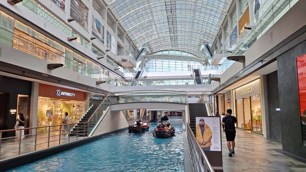 Am nächsten Tag ging es für uns dann erst einmal ins berühmte Marina Bay Sands Hotel, bzw. in das darunter liegende Einkaufszentrum. Dieses ist so riesig, dass man sich wie in Venedig mit Gondeln durch einen künstlichen Kanal schippern lassen kann.