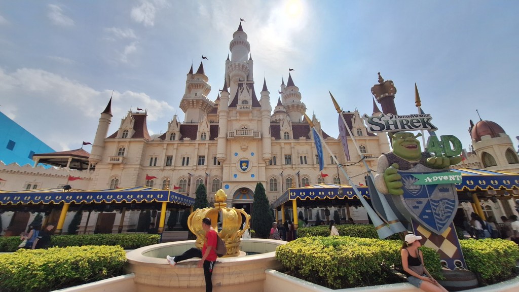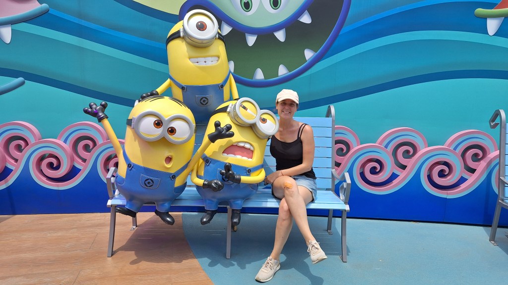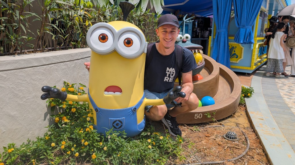 Nachdem wir endlich im Park waren, beschlossen wir, so schnell wie möglich in den hinteren Teil des Parks zu gehen, um gleich die dortigen Attraktionen zu machen. Dieser Plan ging immerhin auf und wir konnten ohne großes Anstehen eine Achterbahn und eine Rafting Attraktion fahren. Und das war es dann auch schon fast, denn die Wartezeiten schossen minütlich in die Höhe, bei einer großen Achterbahn auf über 2,5h! So schauten wir uns nur noch zwei Shows an und ansonsten noch den immerhin hübsch gestalteten Park – machten Fotos mit Minions und Figuren aus der Sesamstraße. Da es immer mehr Menschen wurden und wir am gleichen Tag noch über die Grenze nach Malaysia mussten, verließen wir den Park am frühen Nachmittag wieder. Solltet ihr mal in Singapur sein – geht hier lieber nicht hin. Die Schlangen vor den Fahrgeschäften sind einfach zu lange und man verbringt den Großteil seiner Zeit mit Warten.