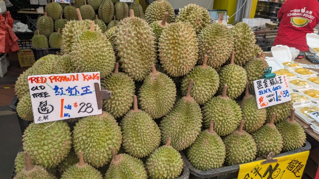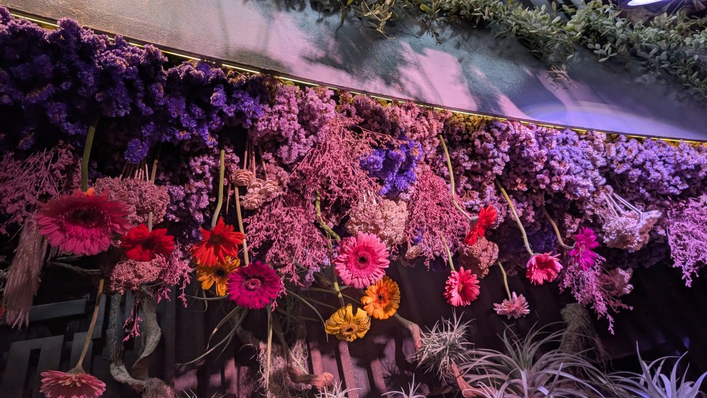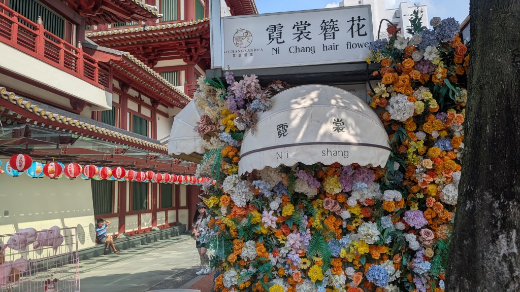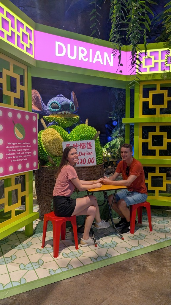 Von hier aus wollten wir dann rüber zu den benachbarten Gardens by the Bay, aber ein heftiger tropischer Regen hielt uns für’s Erste im Einkaufszentrum gefangen – gibt sicherlich schlimmere Orte, um festzuhängen. Nachdem es irgendwann aufhörte, konnten wir hinüber zur Floral Fantasy – einer indoor Blumenausstellung. Der letzte Stopp für diesen Tag war dann ein kleiner Food Market.
