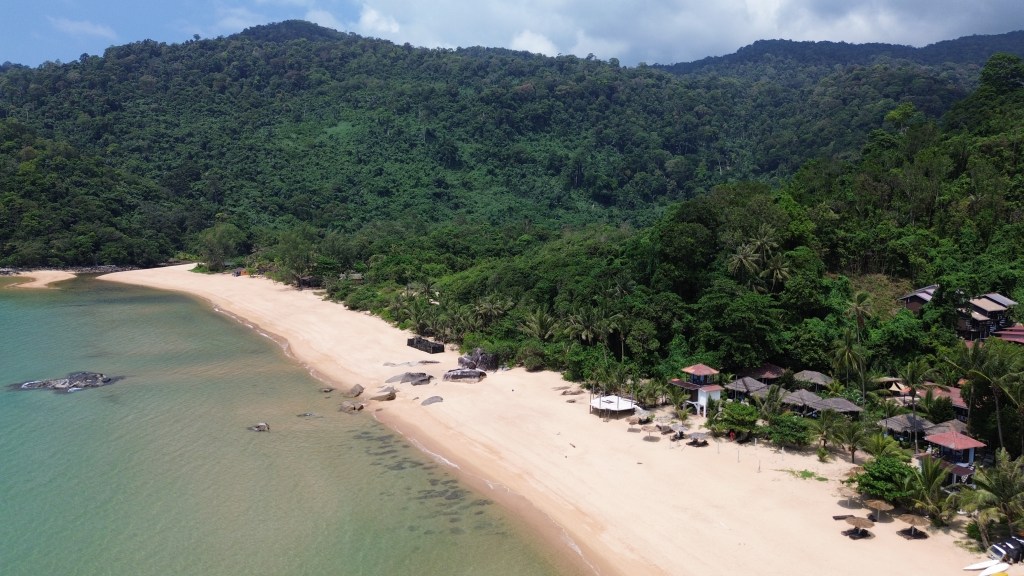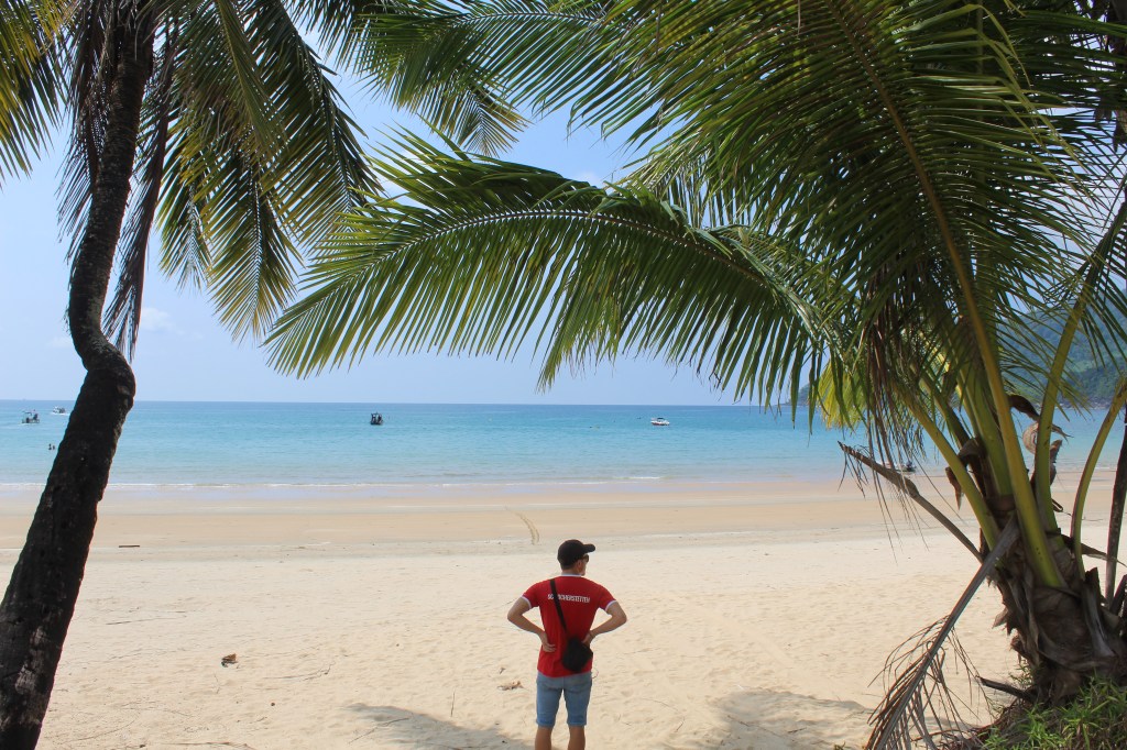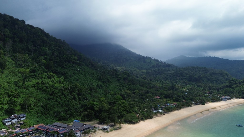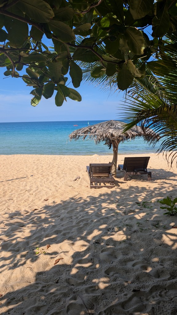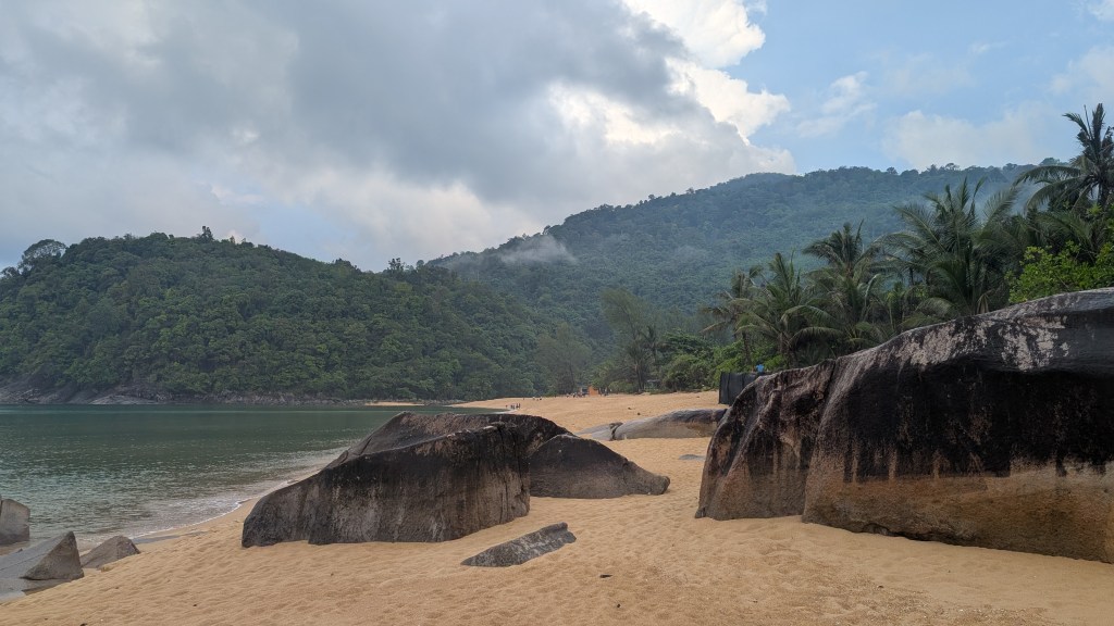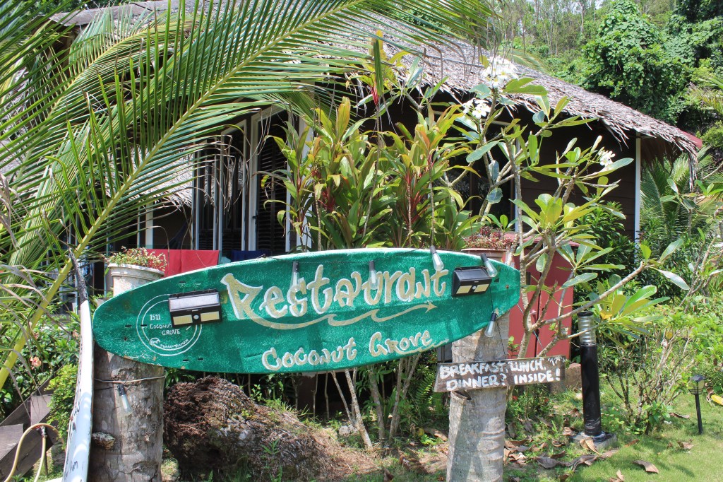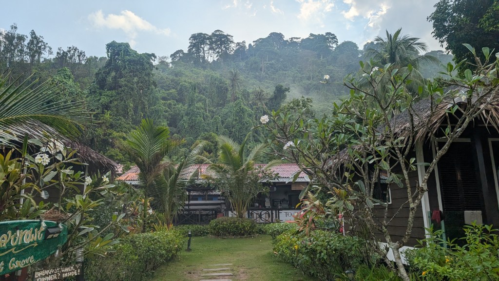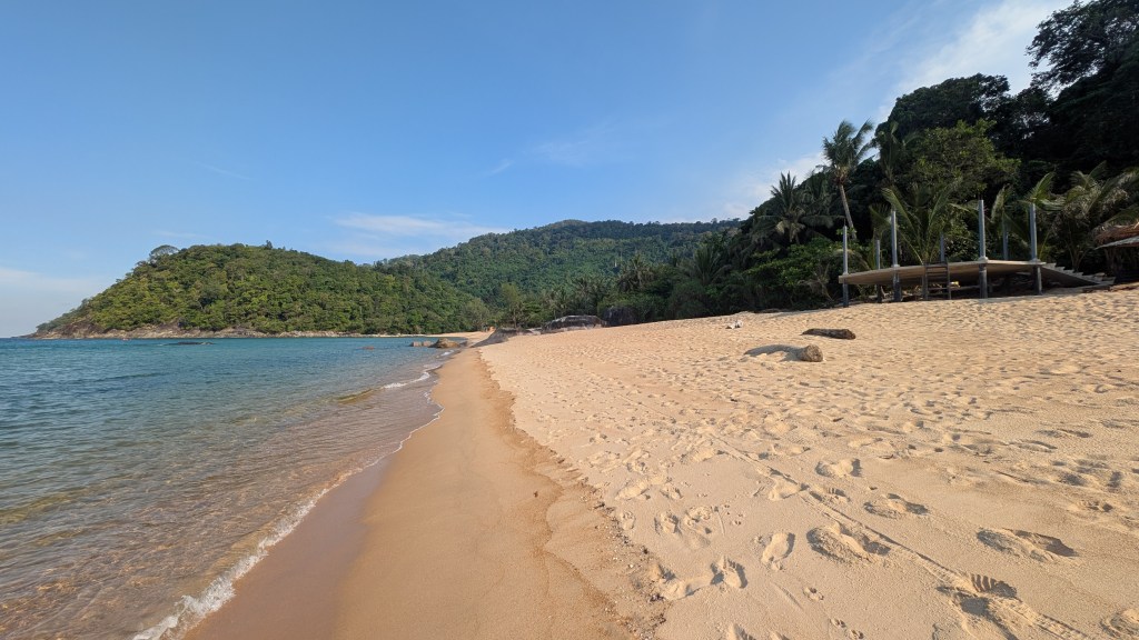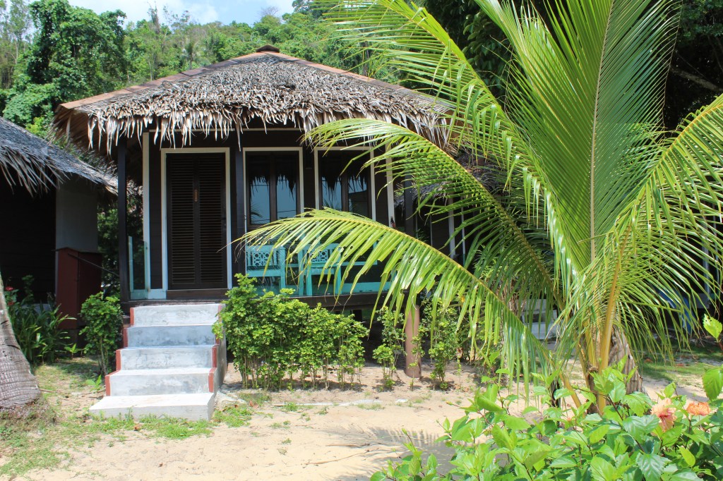 Da sich unsere Unterkunft auf der anderen Seite der Insel befand, mussten wir erst einmal mit dem Shuttle einmal über die komplette Insel fahren. Hierfür gibt es eine einzige Straße, die durch das Landesinnere führt und die, aufgrund der bergigen Landschaft, teilweise eine sehr drastische Steigung hatte. Während der 25-minütigen Fahrt fuhren wir durch wunderschönen Regenwald, vorbei an kleinen Hütten und Steffen sichtete sogar einen riesigen Waran, der sich gerade in einem kleinen Fluss abkühlte. Angekommen auf der anderen Seite der Insel, fühlten wir uns – ungelogen- sofort wie im Paradies! Unsere Unterkunft bestand aus einigen kleinen Bungalows, die sich direkt am goldgelben Sandstrand befanden. Den Strand selbst konnten wir teilweise sogar ganz für uns alleine genießen. Vor allem abends, wenn die Sonne so langsam unterging, war es einfach immer am Schönsten noch einmal kurz ins Meer zu springen. Einfach toll!