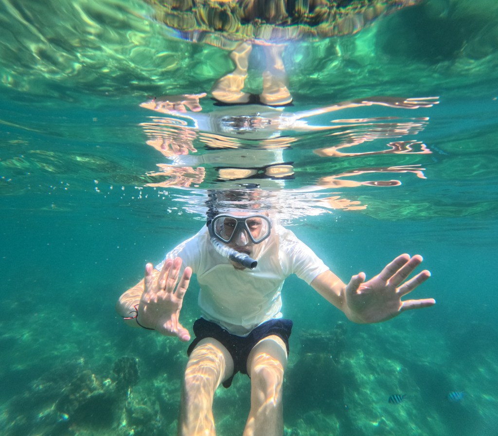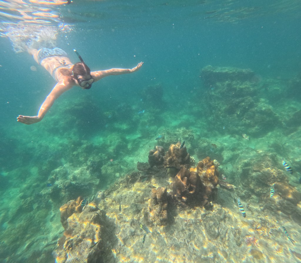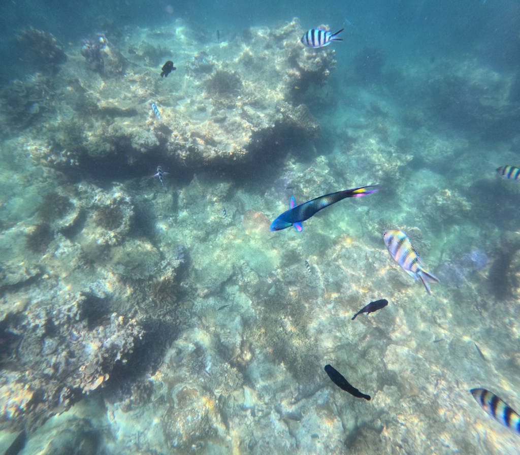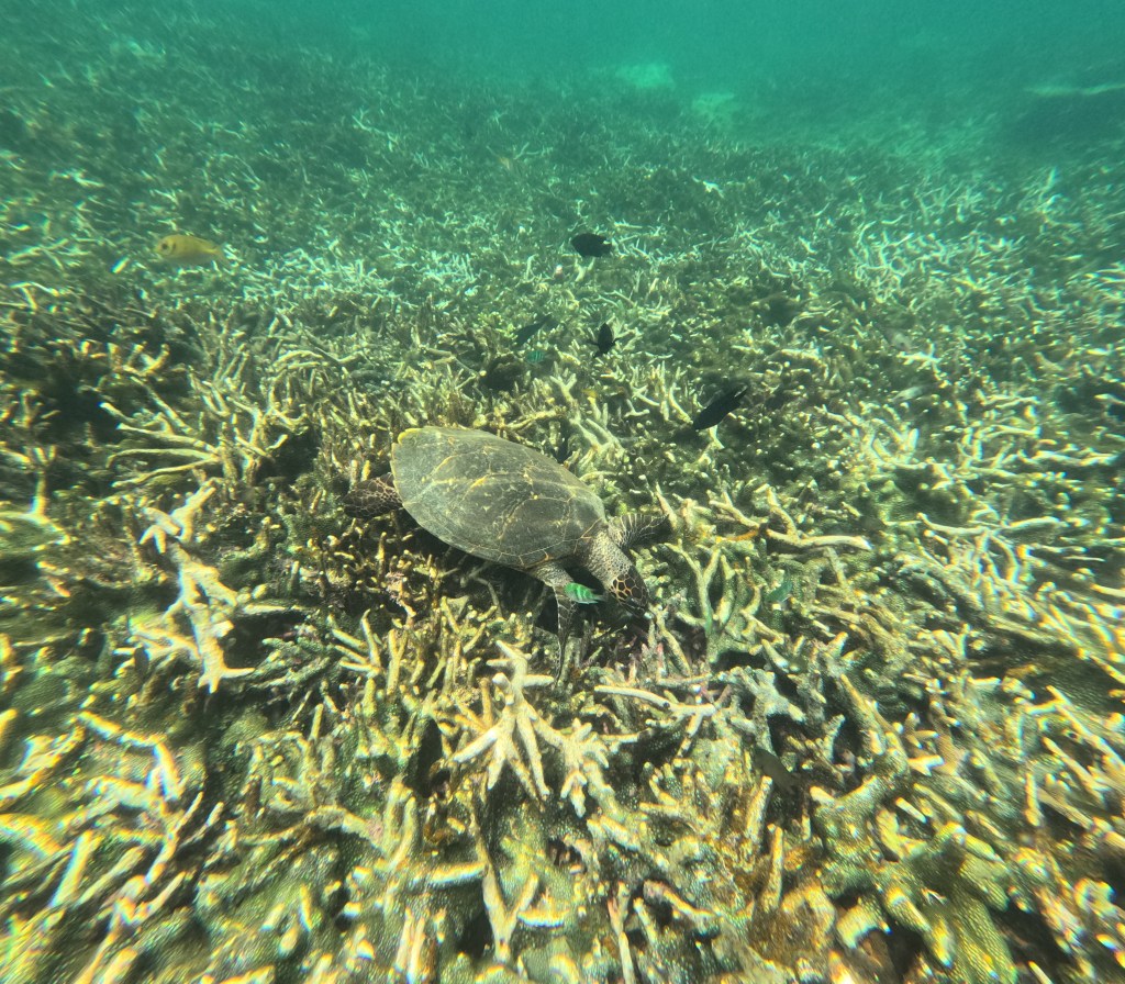 So hatten wir das Glück eine grüne Meeresschildkröte zu erblicken, die gerade an den Korallen knabberte. Fasziniert beobachteten wir diese eine Weile. Kurz bevor wir wieder in Richtung Boot schwimmen wollten, ließ die Schildkröte von den Korallen ab und schwamm direkt neben uns an die Wasseroberfläche, um Luft zu holen. Ein absolut schöner und besonderer Moment! Vor allem wenn man bedenkt, dass die Schildkröten eher selten an die Oberfläche schwimmen, da sie dann ihre empfindliche Unterseite freigeben, die, im Vergleich zu ihrem harten Panzer, sehr verletzlich gegenüber Raubtieren ist.
