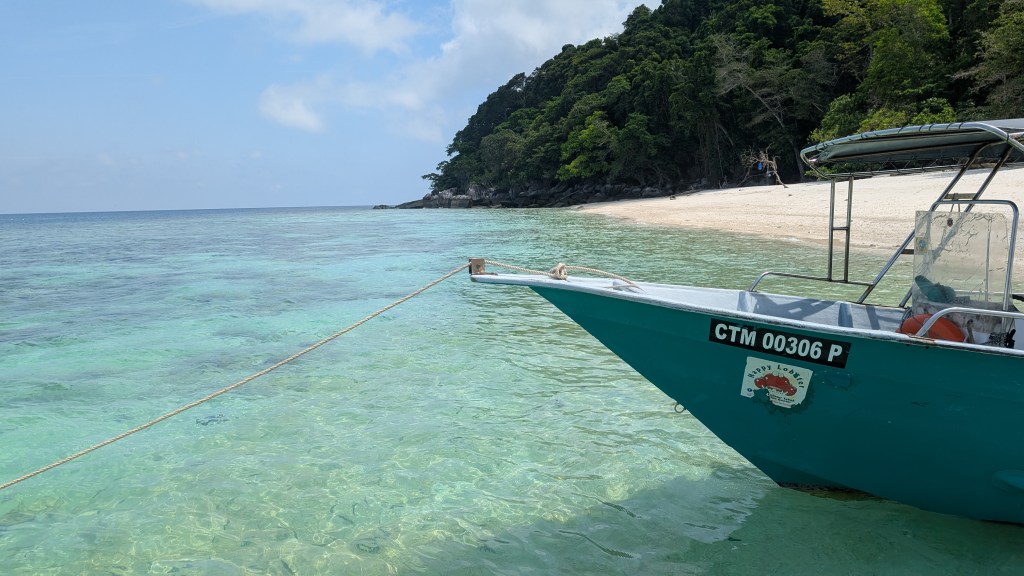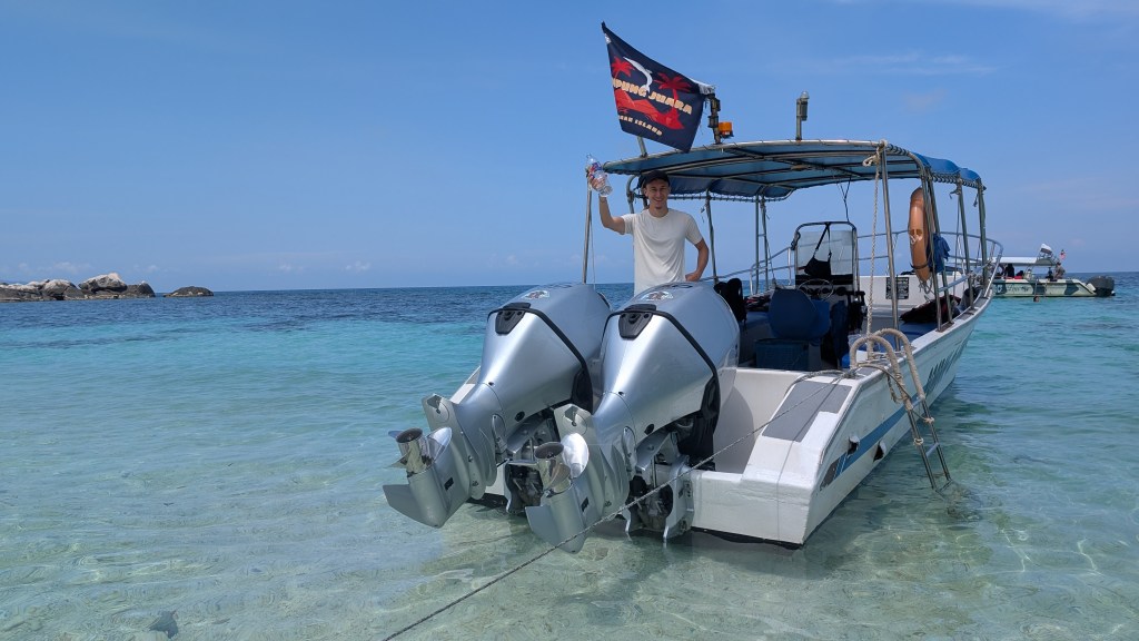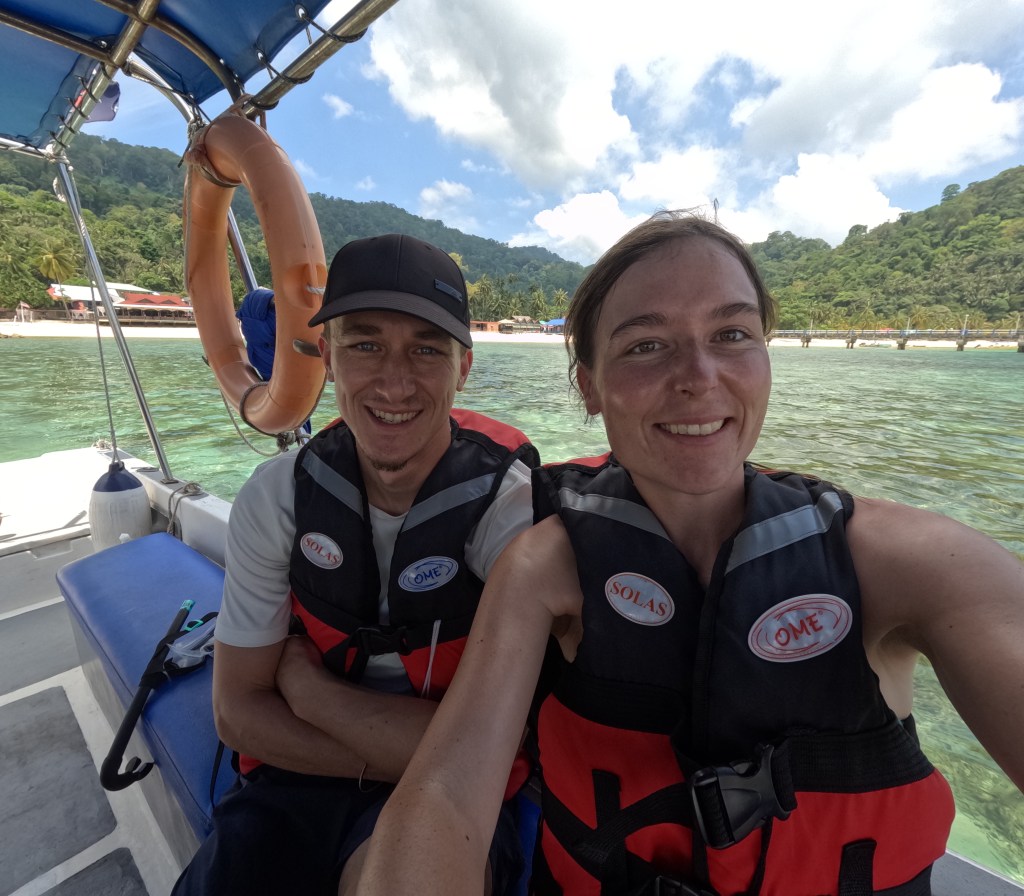 Für den nächsten Tag hatten wir uns dann gleich schon das nächste Highlight vorgenommen. Wir hatten uns unter anderem auch für die Insel Pulau Tioman entschieden, da es hier eine einzigartige Unterwasserwelt gibt. Nach unserem schönen Ausflug in Australien zum Great Barrier Reef, wollten wir so gerne erneut einen Schnorchelausflug machen. Also buchten wir uns über das Hotel eine Tagestour mit einem kleinen Boot. Im Gegensatz zu Australien war dieses Mal alles etwas provisorischer organisiert, aber dafür waren wir eine super kleine Gruppe und hatten sehr viel Zeit an den einzelnen Schnorchelspots. Alleine die Bootsfahrt bis zu den Schnorchelplätzen war atemberaubend schön. Wir fuhren unter anderem an hohen Bergen und üppigem Regenwald vorbei. Zwar waren die Korallen hier nicht annährend so schön wie beim Great Barrier Reef, allerdings gab es Haufenweise bunte Fische und die ein oder andere Überraschung, über die wir uns sehr freuten.