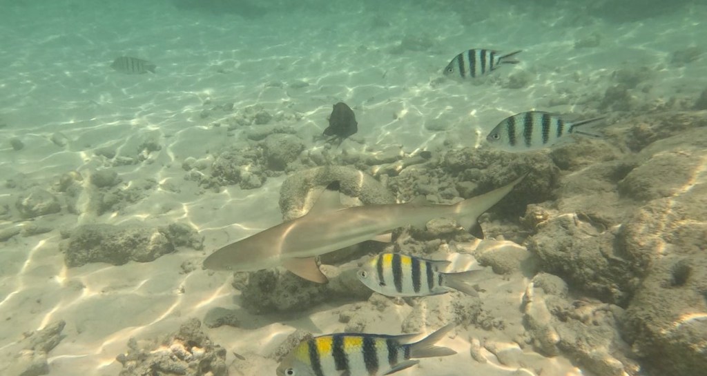 Bei dieser Tour jagte tatsächlich ein Highlight das Nächste! Den krönenden Abschluss machte dann der Stopp auf der kleinen Insel Tulai. Das Besondere an dieser Insel war nicht etwa der strahlend weiße Sandstrand oder das türkisfarbene Meer. Nein – es kommt noch besser! Im seichten Wasser tummelten sich super viele Babyhaie. Um genau zu sein handelt es sich dabei um Babys des Schwarzspitzen-Riffahais, der vor allem im indischen Ozean und im Pazifik vorkommt. Es war schon echt super cool, gemeinsam mit den kleinen Haien im flachen Wasser zu schnorcheln und diese dabei zu beobachten, wie sie ihre Kreise schwammen.