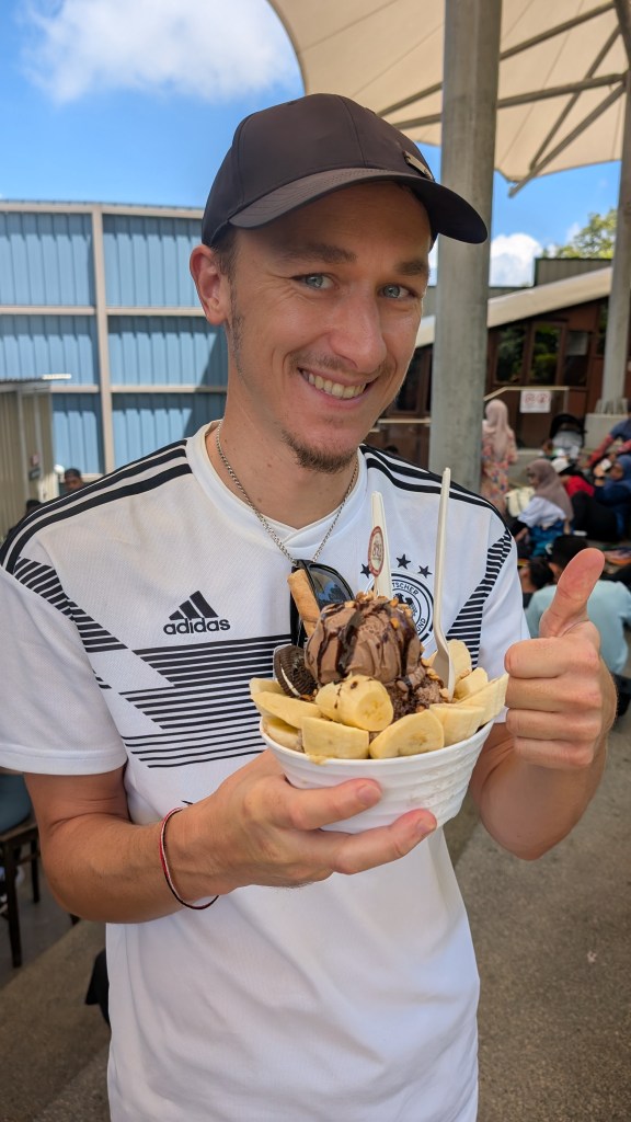 On Top bekommt man noch super erschwingliches Essen und leckeren Nachtisch. Wir probierten das typische Ais Kacang. Die Basis dieses Nachtisches besteht aus Shaved Eis (Eis auf Wasserbasis). Das Topping kann man dann frei wählen. Wir entschieden uns für ein Schokoladenmilcheis, Schokosoße und Bananen als Topping – echt lecker 🤤.