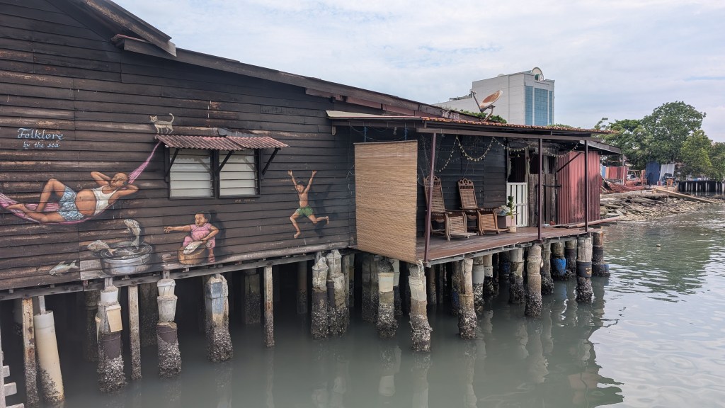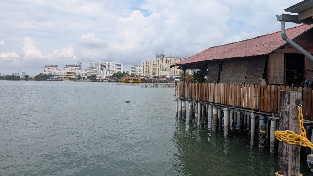 Da wir noch ein paar Tage in Malaysia zur freien Verfügung hatten, entschieden wir uns noch etwas länger auf Penang Island zu bleiben, aber die Unterkunft zu wechseln. Bevor wir unsere andere Unterkunft bezogen, machten wir jedoch noch einen kleinen Abstecher an den Hafen. Dort besuchen wir das Chew Jetty Clan Village. Dabei handelt es sich um eine, auf Stelzen befindliche, Holzsiedlung direkt am Meer. Die Geschichte dieser Siedlung geht bis ins späte 19. Jahrhundert zurück, als sich chinesische Einwanderer auf der Suche nach einem besseren Leben in Penang niederließen. Die Nachkommen dieser Einwanderer leben bis heute hier, haben ihre eigene kleine Gemeinde geschaffen und betreiben mittlerweile auch eigene, kleine Geschäfte.