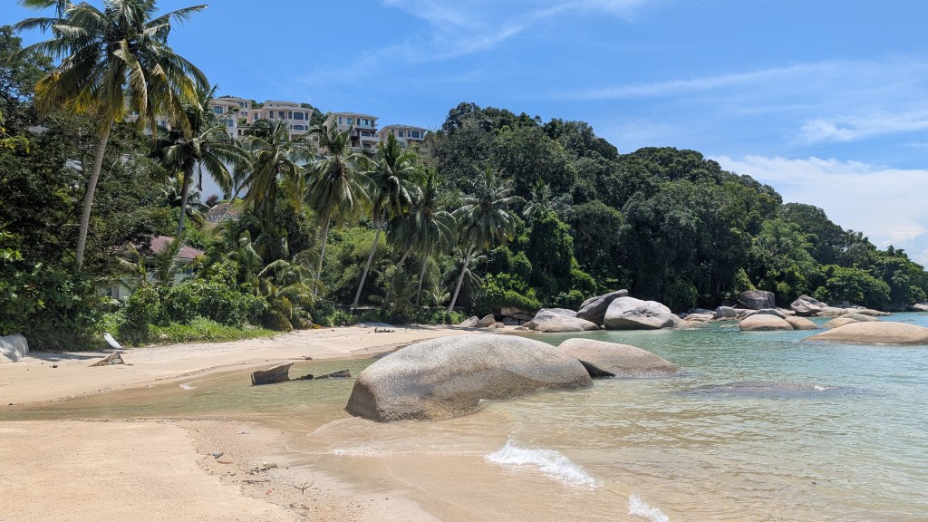 Die nächsten Tage wohnten wir etwas außerhalb von George Town, aber – wie soll es auch anders sein – wieder direkt in einem Einkaufszentrum. Da wir ja auch noch unser Mietauto hatten, wollten wir noch etwas die Insel damit erkunden. So fuhren wir einmal die komplette Insel ab. Wir machten einen Stopp an wunderschön grünen Reisfeldern, besuchten eine tropische Fruchtfarm und machten Halt an einem verlassenen kleinen Strandabschnitt.
